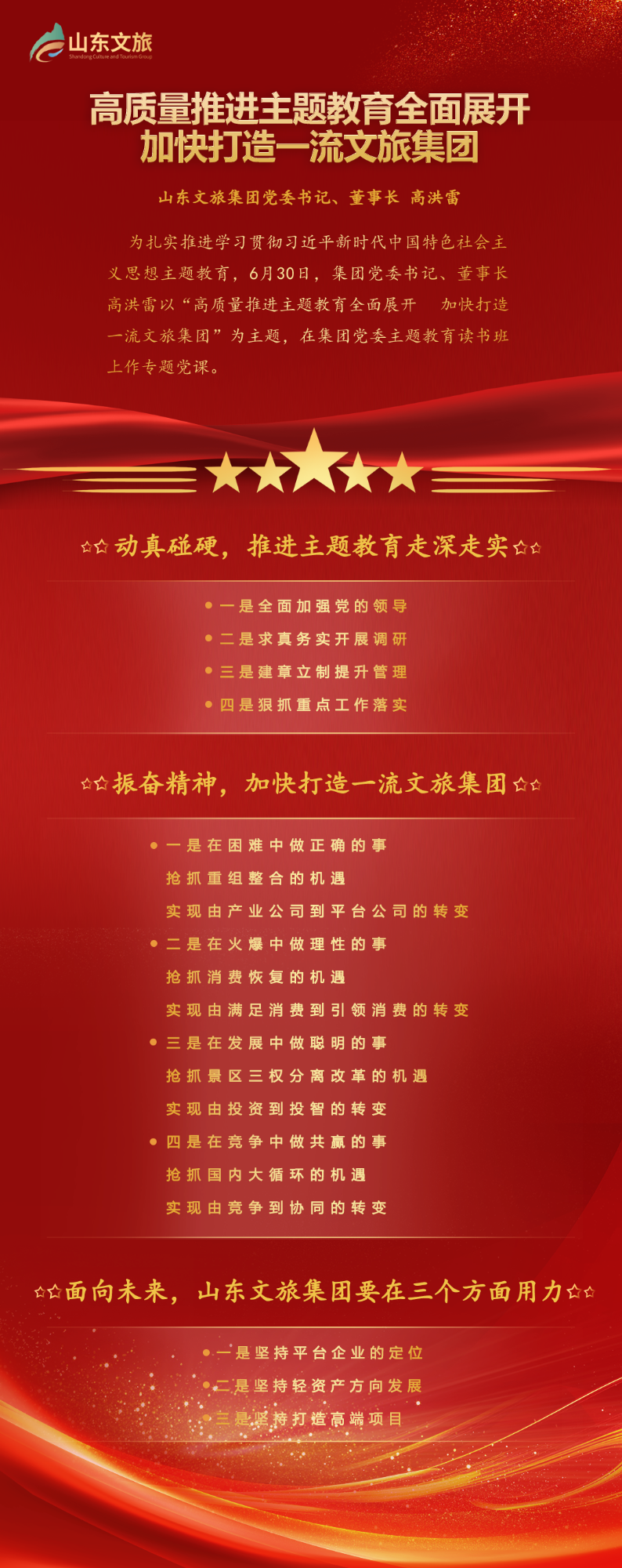 为扎实推进学习贯彻习近平新时代中国特色社会主义思想主题教育,6月30日,集团党委书记、董事长高洪雷以“高质量推进主题教育全面展开 加快打造一流文旅集团”为主题,在集团党委主题教育读书班上作专题党课,集团党委副书记、总经理丁艺主持。