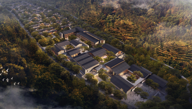 鲁商九女峰乡村振兴学院坐落于九女峰乡村度假区,占地58亩,总建筑面积3万平方米,规划开辟了迎宾厅、影视厅、样板厅、报告厅、多功能厅、鲁商大集、学院教室等功能区域,可同时容纳400人住宿、1000余人培训学习。