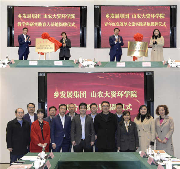 3月12日,鲁商乡村发展集团有限公司(简称“乡发展集团”)与山东农业大学资源与环境学院(简称“山农大资环学院”)在泰山·九女峰“云合景从”会议室召开战略合作签约暨揭牌仪式。山农大资环学院党委书记冯国营,院长、教授诸葛玉平,山东农业大学教务处副处长接玉玲,学工处副处长姜芳,乡发展集团董事长张建峰等参加活动。乡发展集团副总经理马光金主持签约暨揭牌仪式。